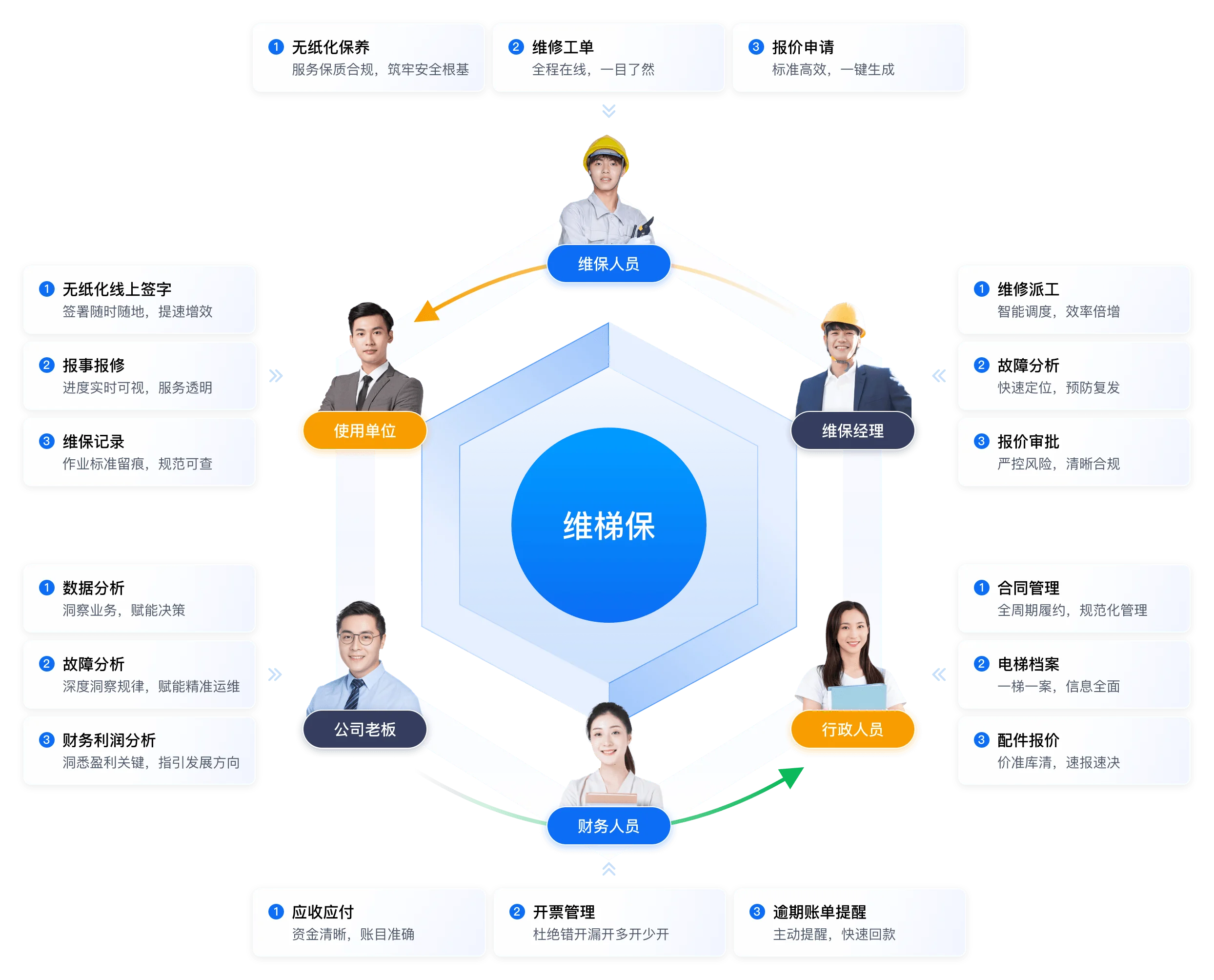 合同、使⽤单位、电梯档案数字化管理,企业组织架构、⼈员档案、专业证书数字化管理,费⽤报销、付款申请、请假、领料等OA办公审批全流程线上协同